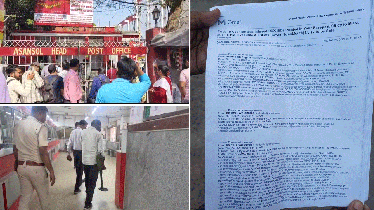 সংবাদদাতা,আসানসোল ও বাঁকুড়াঃ- আদালত চত্বরে বোমাতঙ্কের পর এবার পাসপোর্ট অফিসে বোমাতঙ্ক। পরপর দুদিন মঙ্গলবার এবং বুধবার আসানসোল আদালতে বোমাতঙ্কে হুমকির ইমেল আদালত চত্বরে আতঙ্ক সৃষ্টি হয়েছিলো। এরইমধ্যে, বৃহস্পতিবার সকালে আসানসোলের জিটি রোড বাজার এলাকার প্রধান ডাকঘর বা মুখ্য পোস্ট অফিস কমপ্লেক্সের পাসপোর্ট অফিসেও বোমা হামলার হুমকির ইমেল আসে। যা নিয়ে পোষ্ট অফিস চত্বর সহ গোটা এলাকায় বোমাতঙ্ক ছড়ায়।