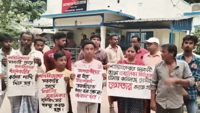 সৌভিক সিকদার, বোলপুর -: বীরভূমের শান্তিনিকেতনে এক নাবালিকা নির্যাতনের ঘটনায় উত্তপ্ত হয়ে উঠল থানা চত্বর। সোমবার, ‘বহ্নিশিখা’ নারী নিগ্রহ প্রতিবাদ কমিটির নেতৃত্বে কয়েক’শ গ্রামবাসী এবং নির্যাতিতার পরিবার শান্তিনিকেতন থানায় বিশাল বিক্ষোভ মিছিল এবং ডেপুটেশন কর্মসূচি পালন করেন। এই আন্দোলনকে কেন্দ্র করে দিনভর রণক্ষেত্রের চেহারা নেয় এলাকা।