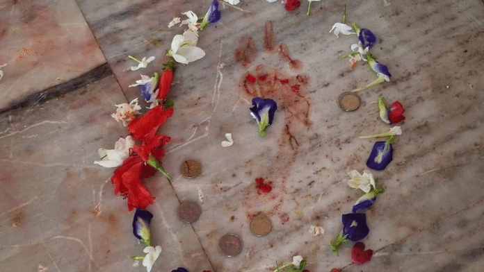 দুর্গা মন্দিরের বেদীতে আলতা পায়ের ছাপ