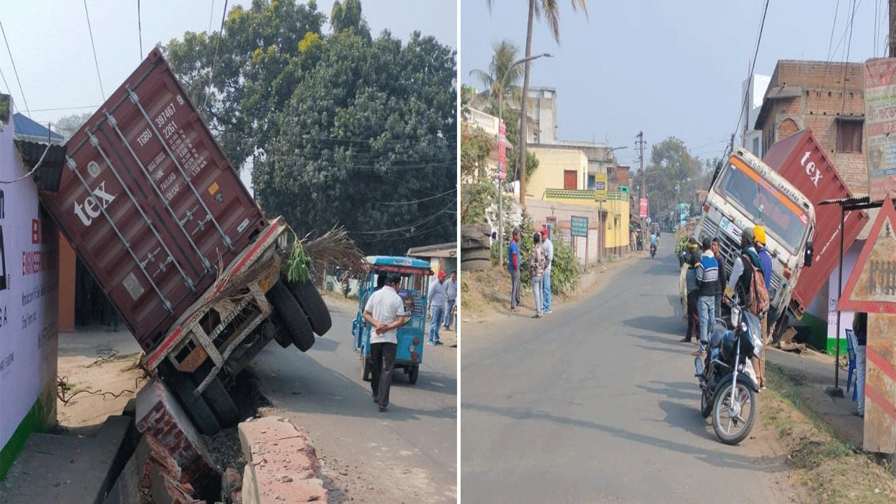 পণ্যবাহী ট্রাক নিয়ন্ত্রণ হারিয়ে ধাক্কা মারল রাস্তার পাশের বাড়িতে