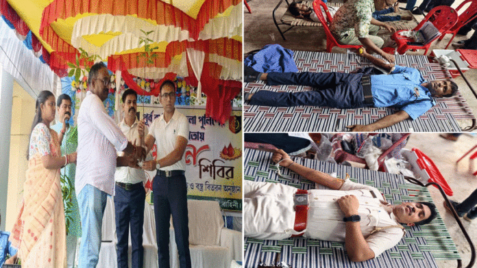 সম্প্রতি আউশগ্রাম থানার ছোড়া ফাঁড়ির উদ্যোগে থানা চত্বরে আয়োজিত হয় এক রক্তদান শিবিরের। রক্ত সংগ্রহ করতে এগিয়ে আসে বর্ধমান মেডিক্যাল কলেজ ও হাসপাতালের ব্লাড ব্যাংক শাখা। সবার সহযোগিতায় শিবির থেকে প্রায় ১০০ ইউনিট রক্ত সংগ্রহ করা হয়। থানার পুলিশ কর্মী ও সিভিক ভলাণ্টিয়ারদের পাশাপাশি বেশ কয়েকজন স্থানীয় রক্তদাতা রক্তদান করেন। ছোড়া ফাঁড়ির ওসি রাহুল দাস নিজেও রক্তদান করেন। সংগৃহীত রক্ত সংশ্লিষ্ট হাসপাতাল কর্তৃপক্ষের হাতে তুলে দেওয়া হয়। ফাঁড়ির পক্ষ থেকে প্রত্যেক রক্তদাতার হাতে একটি করে চারাগাছ তুলে দেওয়া হয়। এছাড়াও কয়েকজন দুস্থর হাতে উপহার হিসাবে বস্ত্র তুলে দেওয়া হয়। কঠোর পরিশ্রমের পর যেভাবে পুলিশকর্মীরা রক্ত দিতে এগিয়ে এসেছেন তাতে সাধারণ মানুষ খুব খুশি। রক্তদাতাদের উৎসাহ দেওয়ার জন্য শিবিরে উপস্থিত ছিলেন অতিরিক্ত পুলিশ সুপার (হেড কোয়ার্টার) অর্ক ব্যানার্জী, ডিএসপি (ডি এণ্ড টি) সুব্রত মণ্ডল, আউসগ্রাম থানার আই সি শান্তনু অধিকারী, ছোড়া ফাঁড়ির ওসি রাহুল দাস সহ সমস্ত পুলিশ কর্মীরা, পানাগড় ফরেস্ট রেঞ্জের অতিরিক্ত ভারপ্রাপ্ত আধিকারিক সুব্রত ব্যানার্জ্জী এবং এলাকার অনেক বিশিষ্ট ব্যক্তিত্ব।