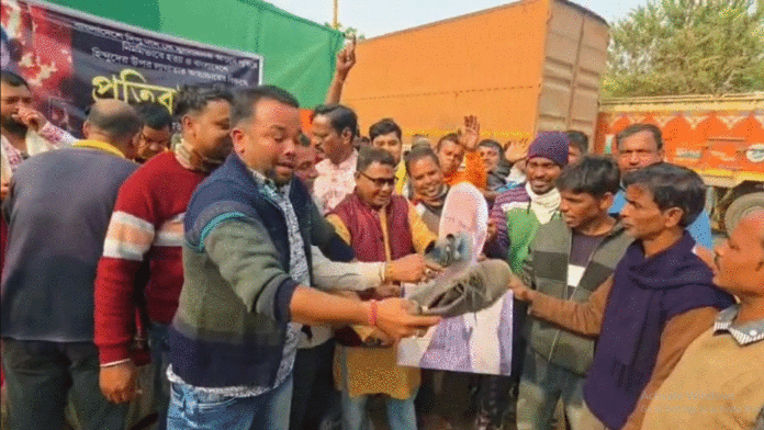 পথসভার শেষে বিজেপি নেতা-কর্মীরা বাংলাদেশের অন্তর্বর্তী সরকারের প্রধান ইউনুসের ছবি লাগানো একটি হোডিংয়ে জুতো মারেন। পরে সেই হোডিং মাটিতে ফেলে সবাই মিলে লাথি মারতে থাকেন।