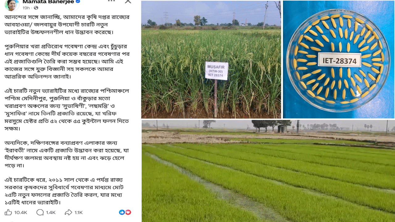 সামাজিক মাধ্যমে করা পোষ্টে মুখ্যমন্ত্রী জানিয়েছেন, পশ্চিমাঞ্চলের তিন জেলা পশ্চিম মেদিনীপুর, বাঁকুড়া, পুরুলিয়ার মতো খরা প্রবণ এলাকার জন্য সুভাষিনী, লছমন্তি ও মুসাফির নামে তিনটি নতুন প্রজাতির ধান বীজ আবিষ্কৃত হয়েছে। খরিফ মরশুমে হেক্টর প্রতি ৫২ থেকে ৫৫ ক্যুইন্ট্যাল ফলন দিতে সক্ষম ওই ধান বীজ। ফলে এই এলাকার চাষীরা উপকৃত হবেন। অন্যদিকে দক্ষিণবঙ্গের বন্যাপ্রবন এলাকার জন্য ইরাবতী নামে একটি প্রজাতি উদ্ভাবন করা হয়েছে যা দীর্ঘক্ষণ জলমগ্ন অবস্থায় থাকলে নষ্ট হয়না ও ঝড়ে হেলে যায় না।