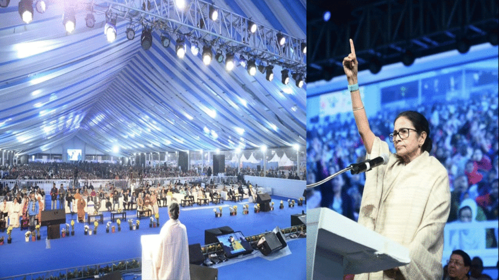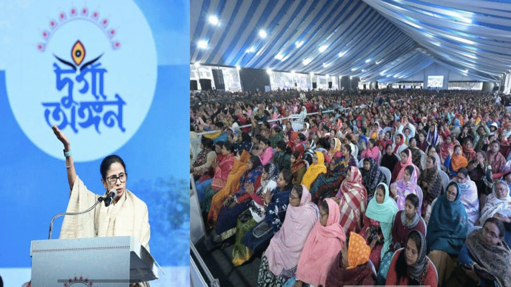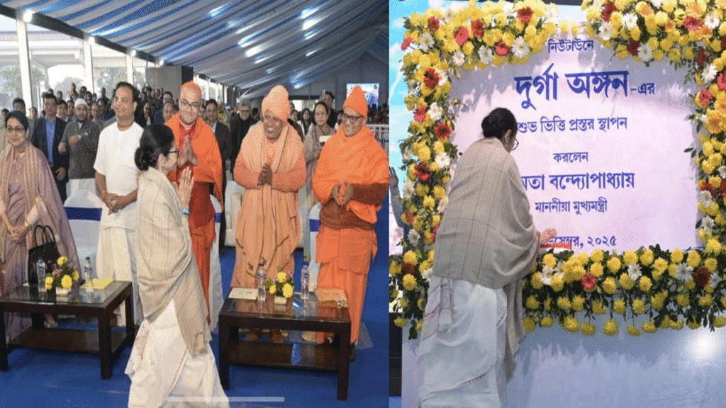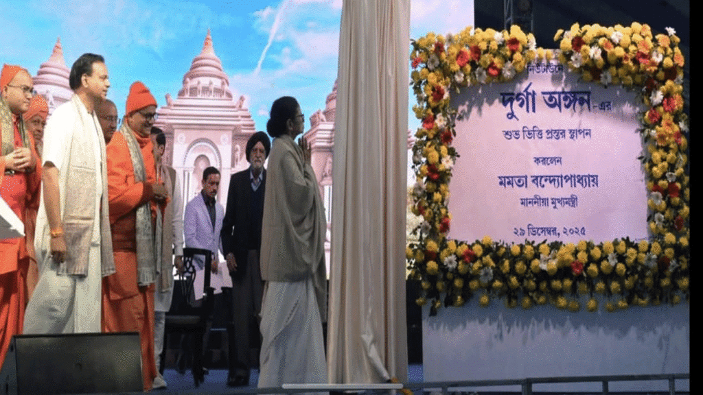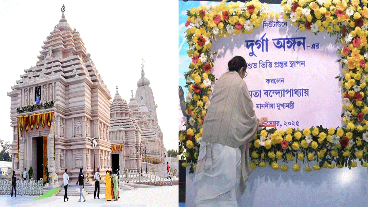 এদিকে, বিশ্বের বৃহত্তম দুর্গামন্দির গড়ে তোলার পথে আরও এক ধাপ এগোল রাজ্য সরকার। গত ২৯ ডিসেম্বর নিউটাউনে দুর্গা অঙ্গনের ভিত্তিপ্রস্তর স্থাপন করে মুখ্যমন্ত্রী মমতা বন্দ্যোপাধ্যায় বিস্তারিত ভাবে তুলে ধরলেন এই মহাপ্রকল্পের পরিকল্পনার খুঁটিনাটি। গত ২১ জুলাই তার দলের শহিদ দিবসের মঞ্চ থেকে কলকাতায় দুর্গা অঙ্গন নির্মাণের ঘোষণা করেছিলেন মুখ্যমন্ত্রী মমতা। এবার ২৯ ডিসেম্বর সেই ঘোষণার বাস্তব রূপ দিতেই রিমোটের বোতাম টিপে বিকেল ৩:৫৬ মিনিটে ভিত্তিপ্রস্তর স্থাপন করলেন তিনি। তার পর ফলকের সামনে লাল রঙের উপর সোনালি সুতোর কাজ করা একটি শাড়ি অর্পণ করতেও দেখা গেল মুখ্যমন্ত্রীকে।