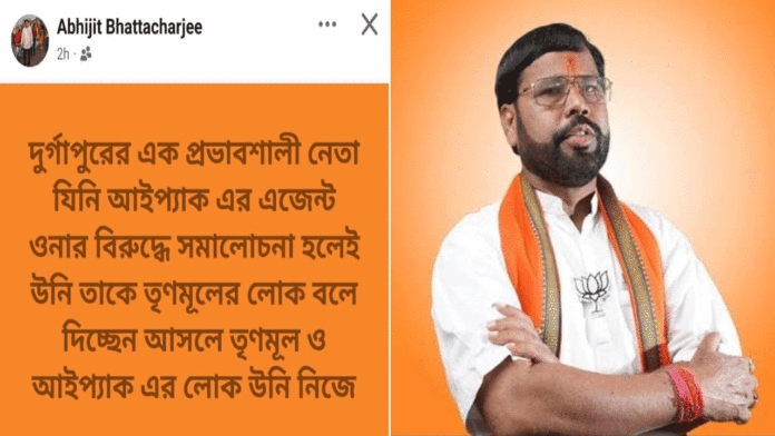 বিজেপির পশ্চিম বর্ধমান জেলা কমিটির সভাপতি অভিজিৎ ভট্টাচার্য সোশ্যাল মিডিয়ায় দুর্গাপুর পশ্চিমের বিধায়ক লক্ষণ ঘড়ুইয়ের বিরুদ্ধে নাম না করে একটি পোস্ট করে লেখেন “দুর্গাপুরের এক প্রভাবশালী নেতা যিনি আইপ্যাকের এজেন্ট ওনার বিরুদ্ধে সমালোচনা হলেই উনি তাকে তৃণমূলের লোক বলে দিচ্ছেন আসলে তৃণমূল ও আইপ্যাকের লোক উনি নিজে।”