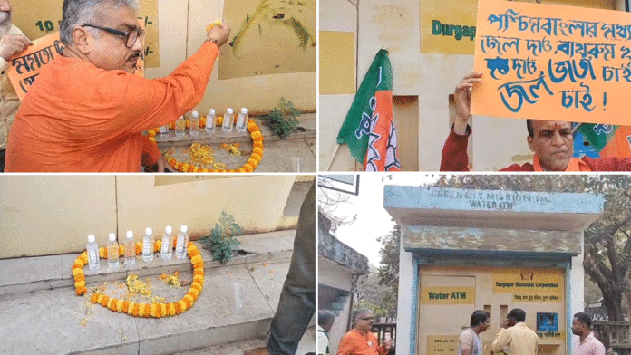 নিজস্ব সংবাদদাতা,দুর্গাপুরঃ- অচল জলের এটিএম ঘিরে বিজেপির অভিনব প্রতিবাদ দুর্গাপুরে। মহকুমা হাসপাতাল ও ইএসআই হাসপাতাল সংলগ্ন এলাকায় থাকা দুটি জলের এটিএমে ফুল-মালা দিয়ে এদিন প্রতীকী ‘শ্রাদ্ধ’ করে বিক্ষোভ দেখান ও প্রতিবাদে সরব হন বিজেপি নেতা ও কর্মীরা। বিজেপি নেতা অমিতাভ বন্দ্যোপাধ্যায় ও তরুণ দাসের নেতৃত্বে বিক্ষোভ কর্মসূচি অনুষ্ঠিত হয়।