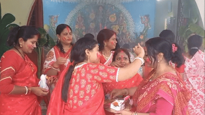 নিজস্ব সংবাদদাতা,দুর্গাপুরঃ- পুজো শেষে মা দুর্গার বিদায়ের পালা। বিজয়া দশমীতে মণ্ডপে মণ্ডপে বাজছে বিদায়ের সুর। আর তার সঙ্গে চিরা চরিত প্রথা অনুযায়ী চলছে মহিলাদের সিঁদুর খেলা। মহিলারা কপালে ও গালে সিঁদুর মাখিয়ে একে অপরকে শুভেচ্ছা জানান। নারীরা বিশ্বাস করেন, এই সিঁদুর খেলা দেবী দুর্গার আশীর্বাদস্বরূপ।