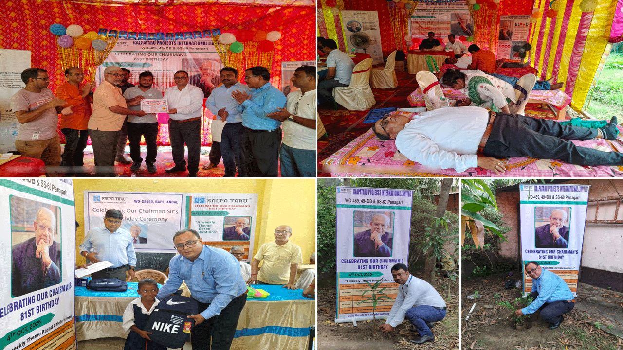 নিজস্ব সংবাদদাতা, দুর্গাপুরঃ- প্রতিবছরই বিভিন্ন সেবামূলক সামাজিক কাজের মধ্যে দিয়ে কল্পতরু পাওয়ার ট্রান্সমিশন লিমিটেড তাদের সংস্থার চেয়ারম্যান মুফতরাজ পি. মুনতের জন্মদিবস পালন করে থাকে দেশের বিভিন্ন ডিভিশনে। এবার তাঁর ৮১ তম জন্মদিবস উপলক্ষে ৯ অক্টবর সারা দেশের বিভিন্ন ডিভিশনে ৫০০০ রক্তদান শিবির ও দুঃস্থ মানুষদের নতুন বস্ত্র প্রদান ও শিশুদের খেলনা প্রদান, বৃক্ষরোপন কর্মসূচী গ্রহণ করা হয়েছিল।