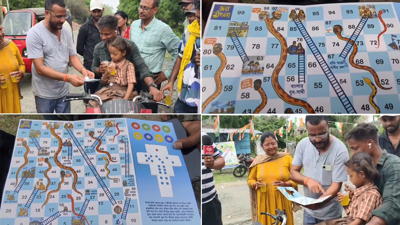 এদিন তৃণমূল কর্মী সমর্থকরা রাস্তায় পথ চলতি সাধারণ মানুষ ও বাইক গাড়ি দাঁড় করিয়ে চালক ও আরোহীদের হাতে তুলে দেয় ঠাণ্ডা পানীয়। পাশাপাশি তাদের হাতে তুলে দেওয়া হয় ‘ সাপ-লুডু’খেলার বোর্ড। তবে এ ‘সাপ-লুডু’ সাধারণ ‘সাপ-লুডু’ নয়। লুডুতে সাপের মাথায় বসানো হয়েছে অমিত শাহ, নরেন্দ্র মোদি, দিলীপ ঘোষ সুকান্ত মজুমদার শমিক ভট্টাচার্যের কার্টুন ছবি। আর মই এর ওপরে রয়েছে রাজ্য সরকারের নানান প্রকল্পের ছবি।