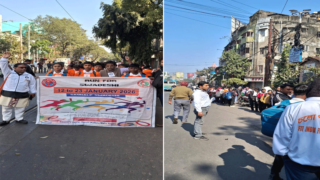 নিজস্ব সংবাদদাতা,কলকাতাঃ- স্বদেশী জাগরণ মঞ্চের উদ্যোগে স্বামী বিবেকানন্দের জন্মদিন ১২ জানুয়ারি থেকে নেতাজী সুভাষচন্দ্র বসুর জন্মদিন ২৩ জানুয়ারি পর্যন্ত সময়কে সামনে রেখে সারা দেশ জুড়ে ‘স্বদেশী দৌড়’-এর আয়োজন করা হয়। স্বদেশী ভাবনার বার্তা ছড়িয়ে দিতেই এই উদ্যোগ বলে জানান উদ্যোক্তারা। এই কর্মসূচির কলকাতা পর্বের অন্যতম গুরুত্বপূর্ণ অধ্যায় সম্পন্ন হল শুক্রবার। এদিন সকালে কলকাতার বিনোদিনী (স্টার) থিয়েটার থেকে শ্যামবাজার পাঁচ মাথার মোড়ে নেতাজীর মূর্তির পাদদেশ পর্যন্ত স্বদেশী দৌড় ও পদযাত্রা অনুষ্ঠিত হয় এবং দৌড়ের আনুষ্ঠানিক সমাপ্তি ঘোষণা করা হয় শ্যামবাজারের নেতাজি মূর্তির পাদদেশে, ঐতিহ্যবাহী নেতাজি জন্মদিবসের মঞ্চে, যেখানে বিগত পঞ্চান্ন বছর ধরে উত্তর কলকাতা নেতাজি জন্ম উৎসব কমিটির উদ্যোগে নেতাজি জন্ম উৎসব পালিত হয়ে আসছে।
