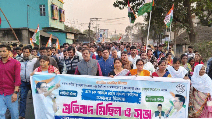 জাতীয় ভোটার দিবসে বাংলার ভোটাধিকার রক্ষায় রাজ্যের বিভিন্ন প্রান্তের সঙ্গে মঙ্গলকোটেও তৃণমূল কংগ্রেসের পক্ষ থেকে একটি প্রতিবাদ মিছিল বের করা হয়।