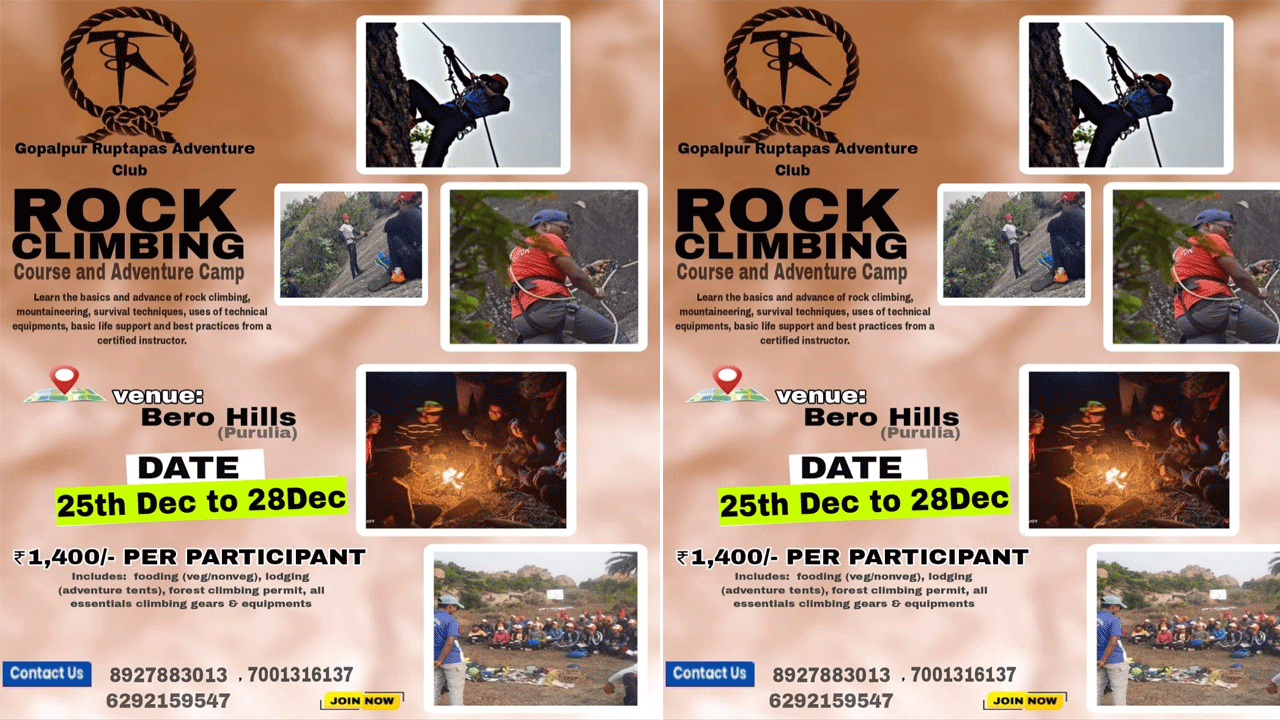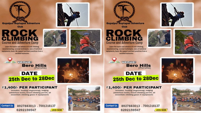 নিজস্ব সংবাদদাতা,দুর্গাপুরঃ- শুরু হয়ে গেছে শীতের মরশুম। সামনেই বড় দিনের ছুটি। আর শীতের ছুটি মানেই বেড়াতে যাওয়া, পিকনিক সহ নানারকম অ্যাডভেঞ্চার অ্যাক্টিভিটিতে অংশগ্রহণ করা। এবারের শীতে এমনই এক অ্যাডভেঞ্চার ক্যাম্পের আয়োজন করছে গোপালপুরের রূপতাপস অ্যাডভেঞ্চার ক্লাব।