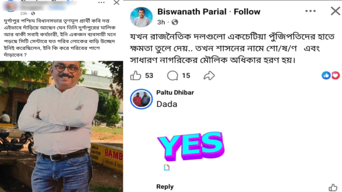 এদিকে বিশ্বনাথবাবু তাঁর পোস্টে কি দুর্গাপুর পূর্ব ও পশ্চিম এই দুই আসনেই ব্যবসায়ী প্রার্থী নিয়ে তির্যক কটাক্ষ করেছেন, নাকি তার লক্ষ্যবাণ শুধুমাত্র দুর্গাপুর পশ্চিম আসনটি লক্ষ্য করে? এই নিয়ে শিল্প শহরের রাজনৈতিক মহলে শুরু হয়েছে জোর রাজনৈতিক তরজা ও জল্পনা।